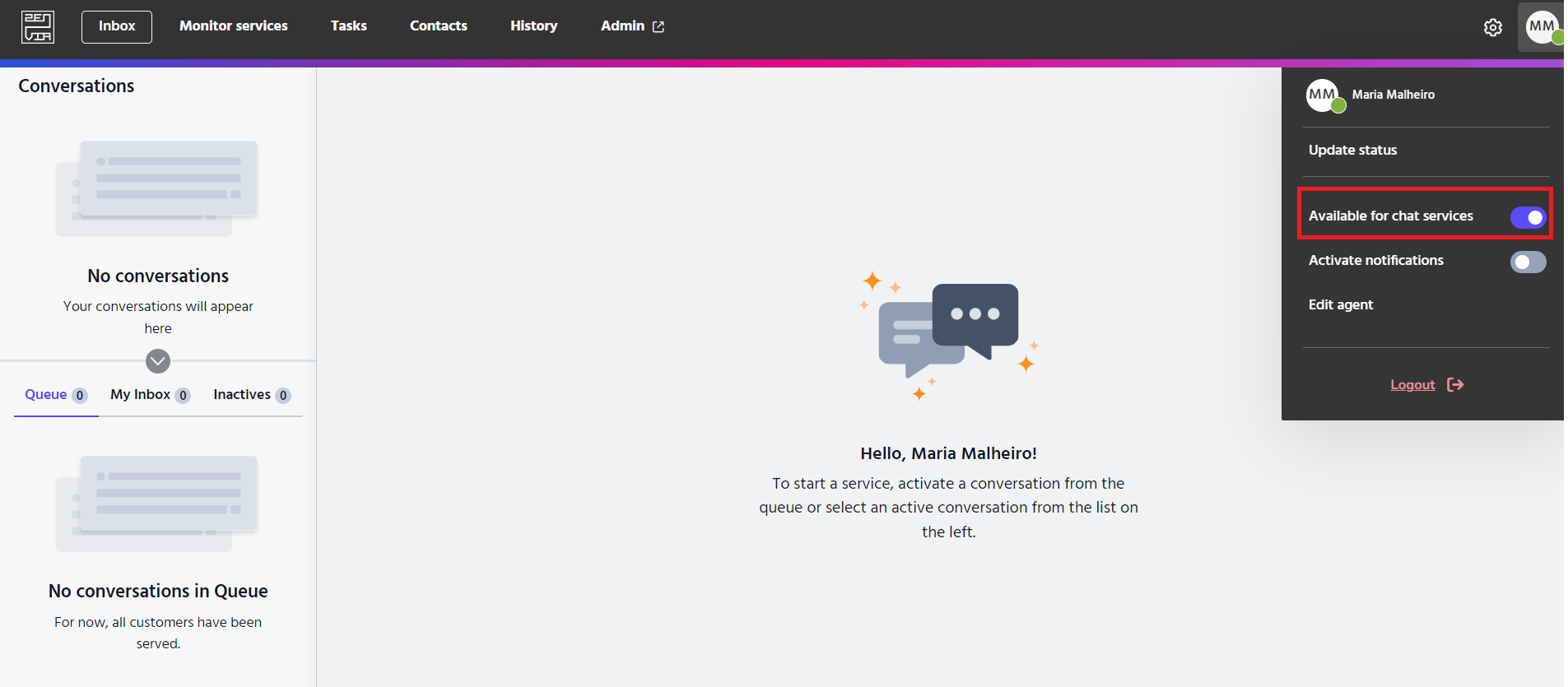 To activate this feature, go to Zenvia Chat → Agent Profile and enable the option Available for service, located in the upper right menu of the screen.