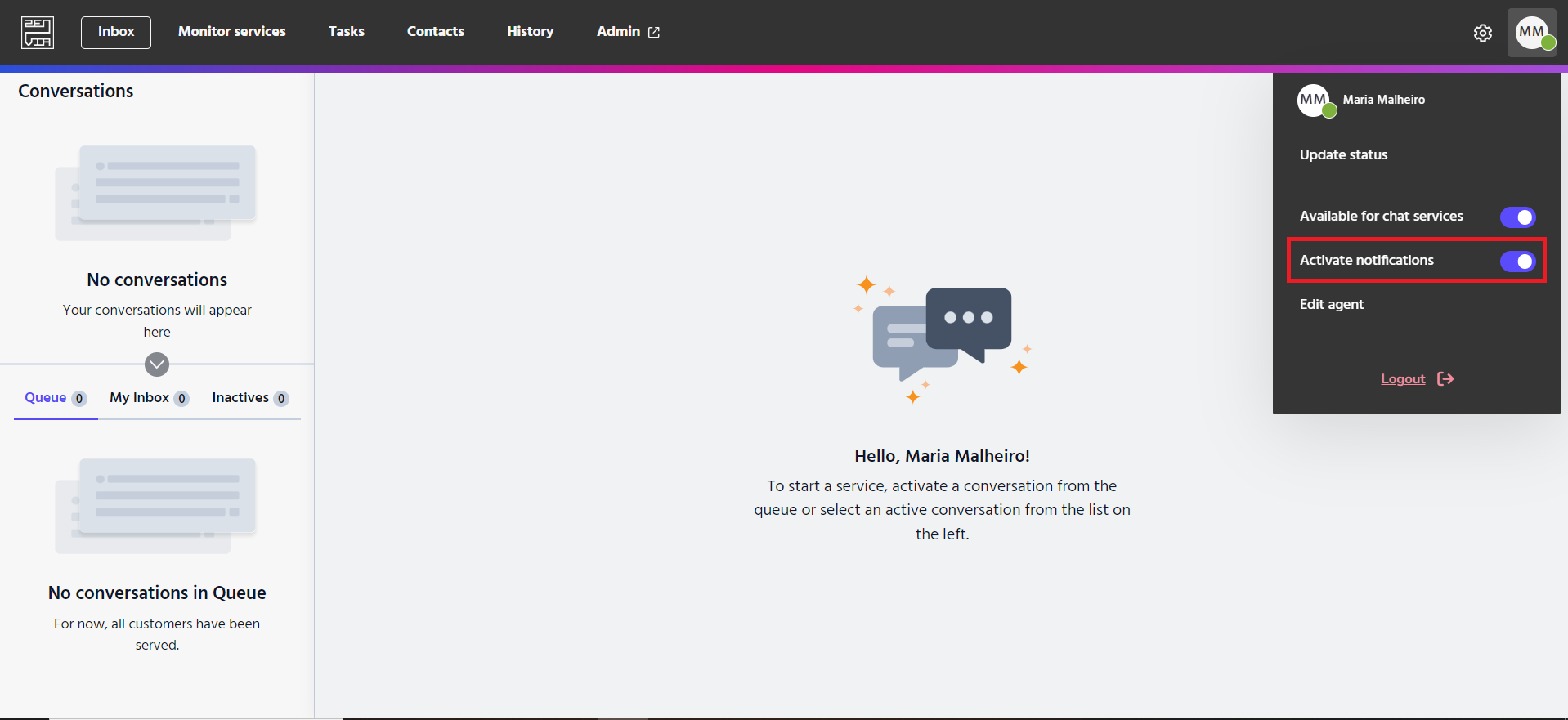 To enable notifications, go to Zenvia Chat - Agent Profile, in the right sidebar menu, and under your username, enable Activate notifications.
