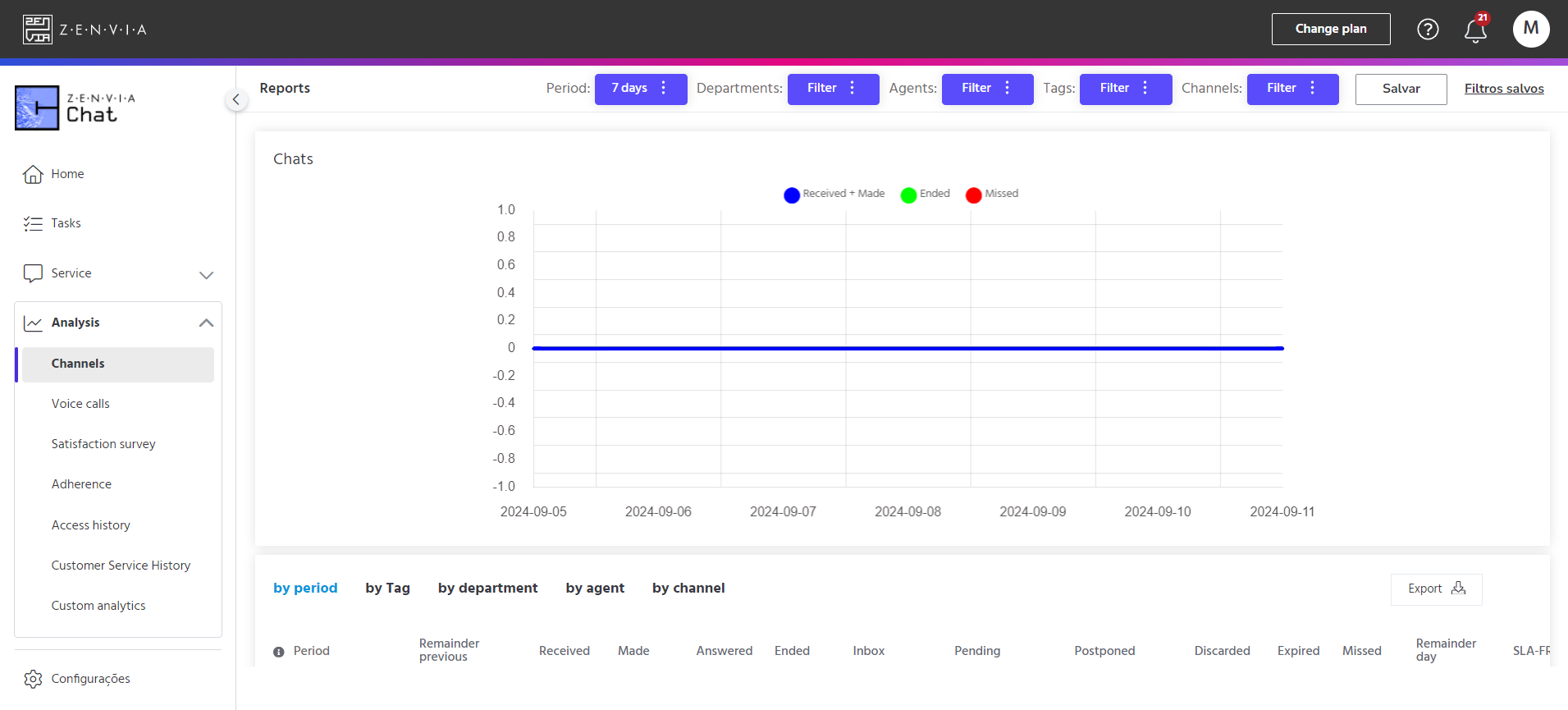 At the top of the page, we can apply initial filters by the desired period, one or more departments, one or more agents, tags, and also by one or more channels. Any filter applied in this area will affect the information on the rest of the page.
