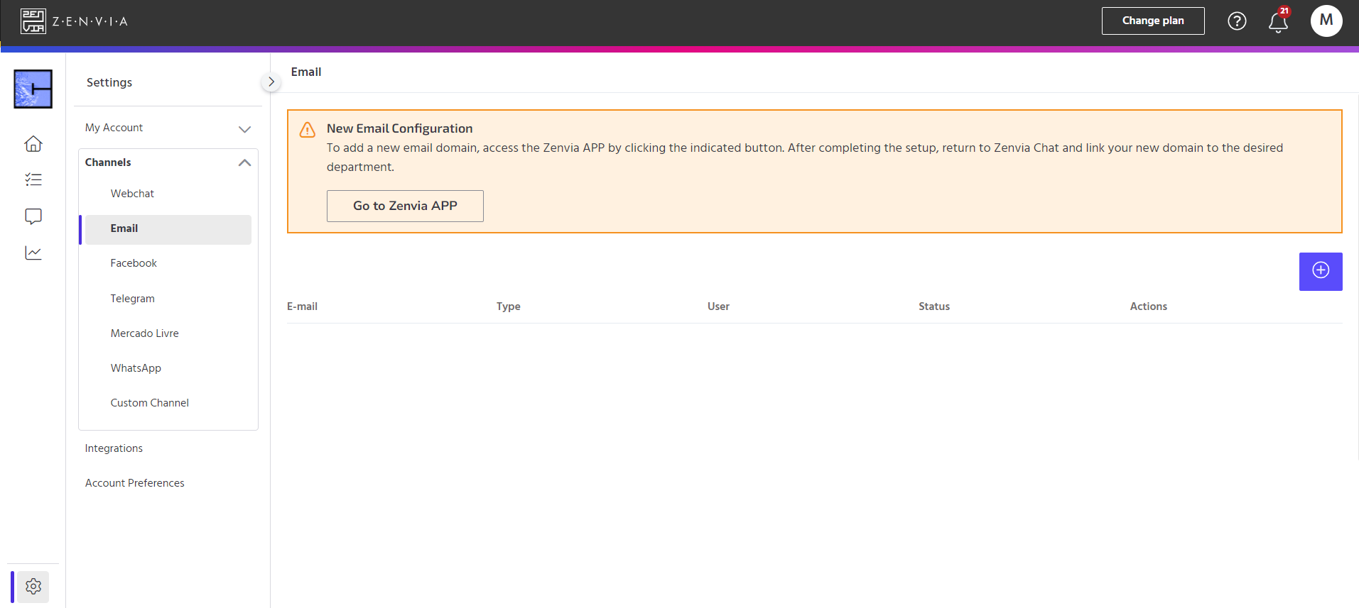 To access this feature, go to Zenvia Chat - Administrator Profile > Settings > ChannelsEmail.