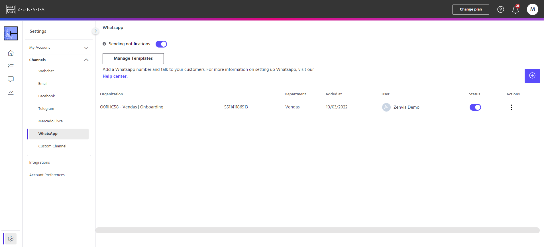 By enabling the WhatsApp channel you allow all messages sent to the contracted number to reach Zenvia Chat.