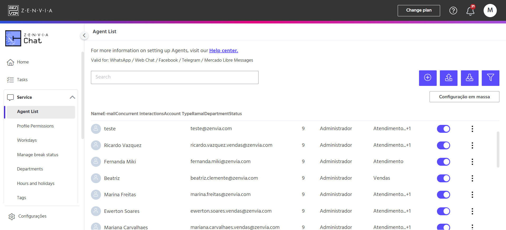 To access it, go to Zenvia Chat - Administrator profile > Service > Agent List.