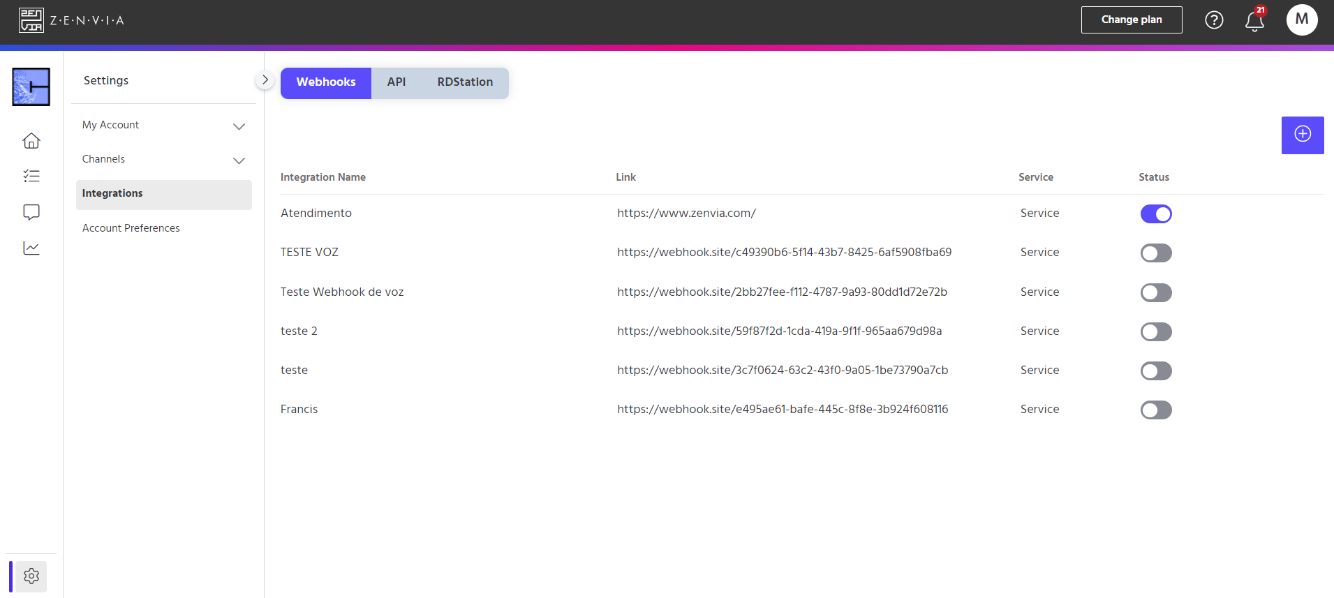 To access this functionality, go to Zenvia Chat - Administrator Profile > Settings > Integrations > Webhook.