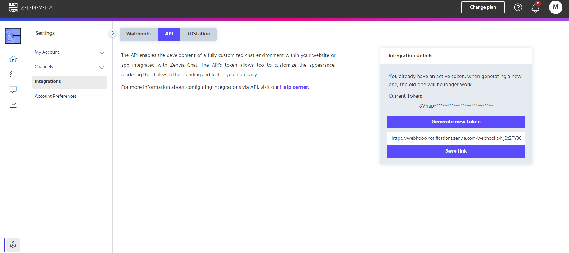 To access this functionality, go to Zenvia Chat - Administrator Profile > Settings > Integrations > API.