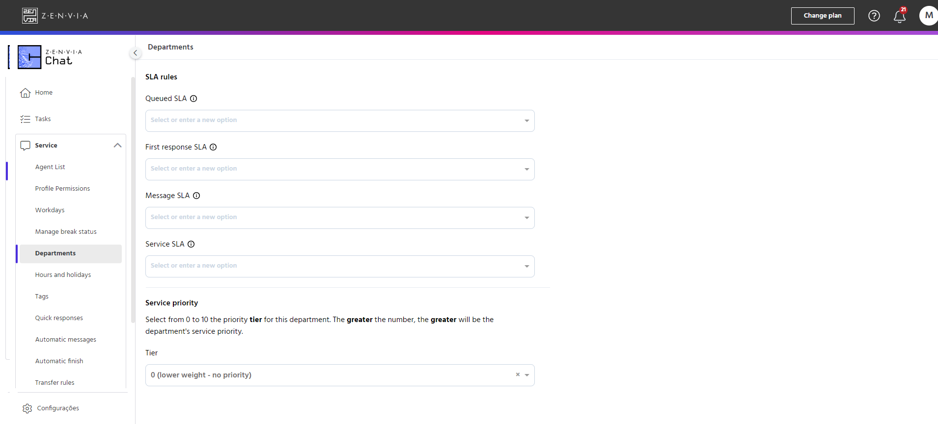 SLAs are intended to improve monitoring of the metrics analyzed by the Administrator and to help agents comply with SLAs (Service Level Agreements). The administrator can configure the time/period for each type of SLA: waiting, first response, message and service.