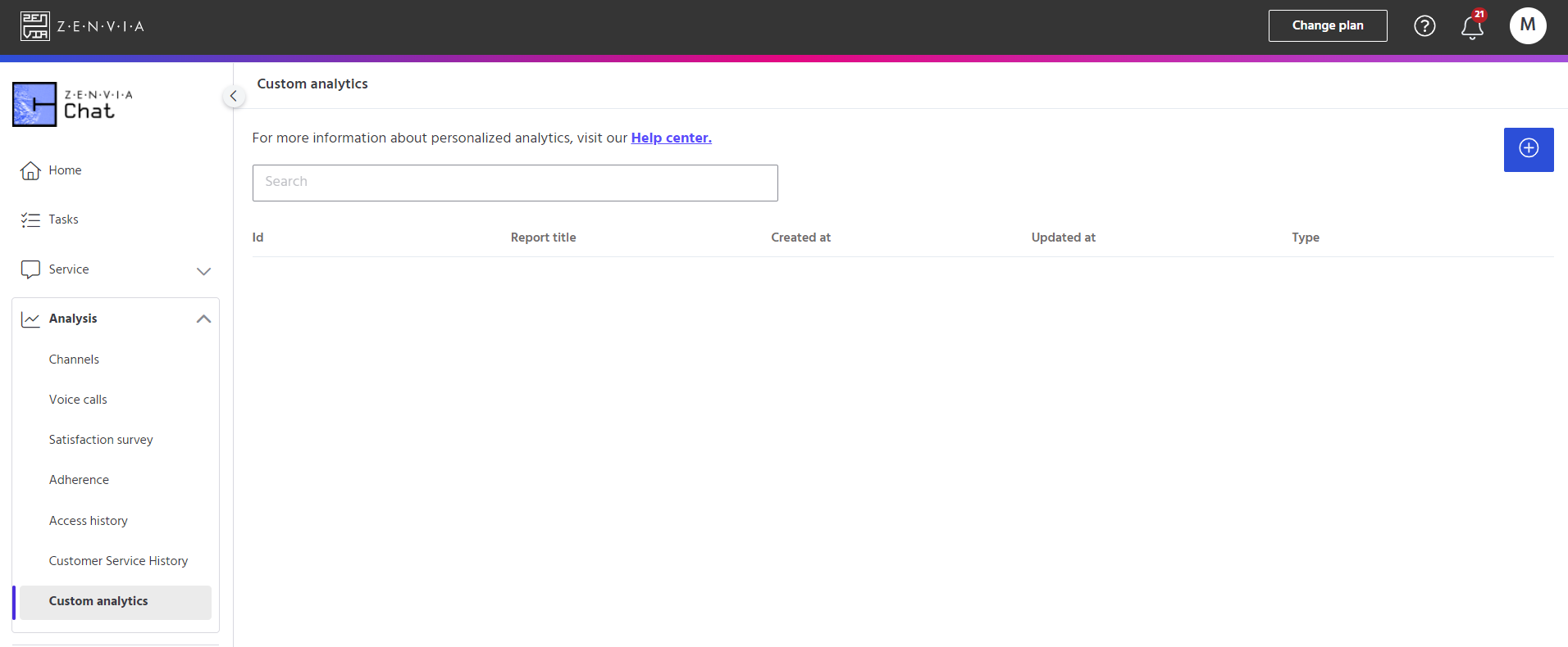 To create a new custom analysis, go to Zenvia Chat - Administrator Profile > Analysis > Custom Analytics.