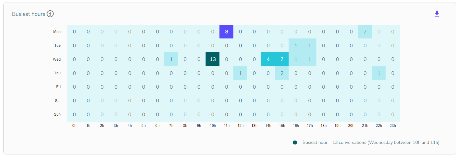 This graph is a heat map that shows the days and hours with the most active conversations. With these metrics, you can better distribute your team's working hours.