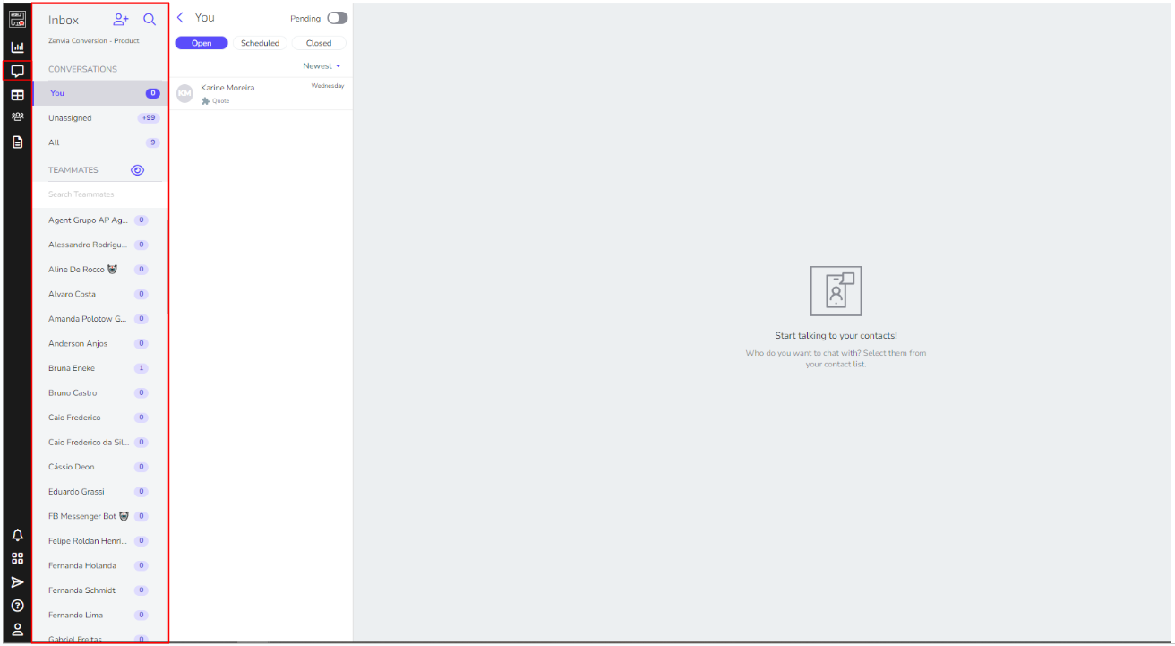 Located in the left sidebar menu, Chats is a module of Zenvia Conversion where interactions and message exchanges between your company and a contact occur.