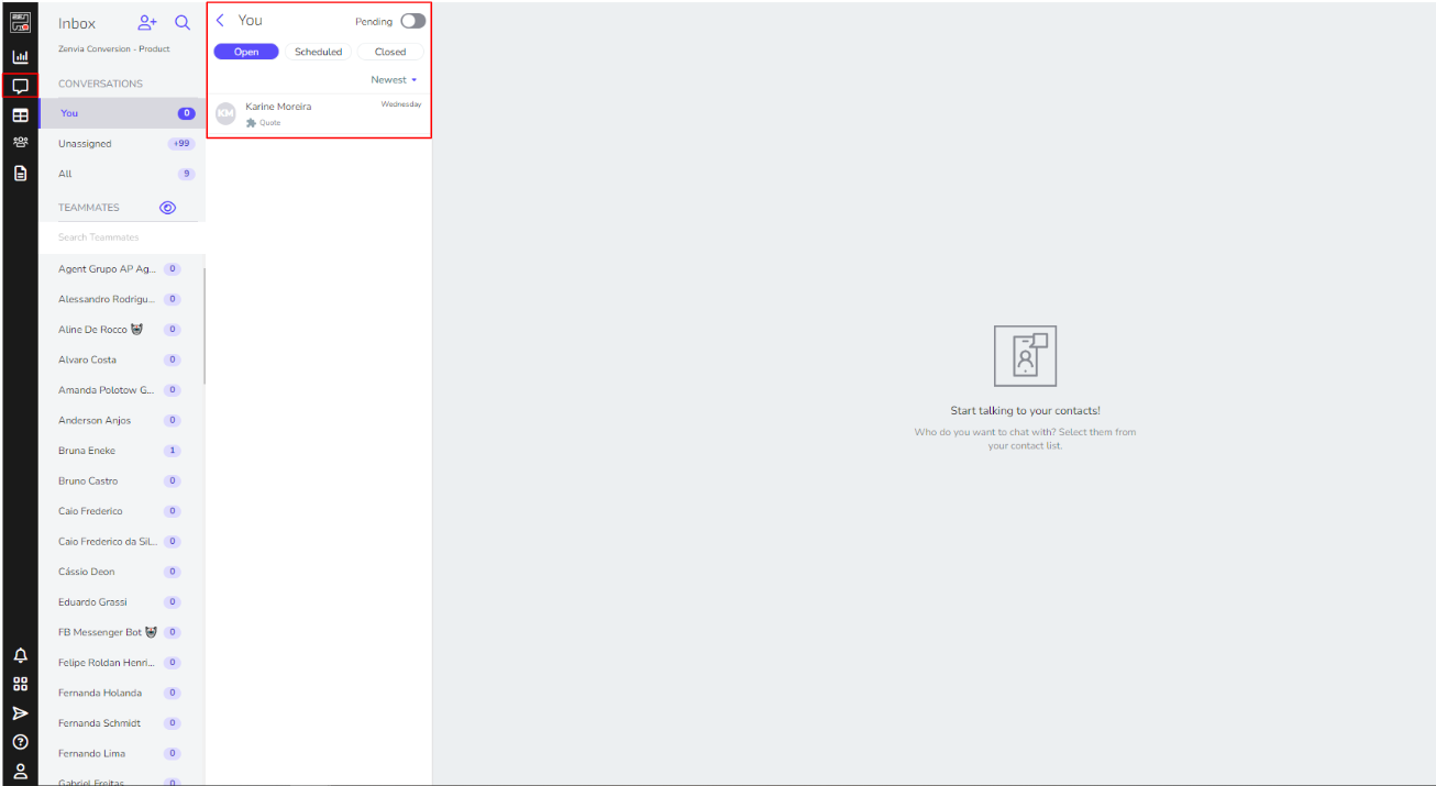 This is the area where the list of chats is located. Every time a contact interacts with your company, whether by sending or receiving a message through any communication channel, it will appear here: