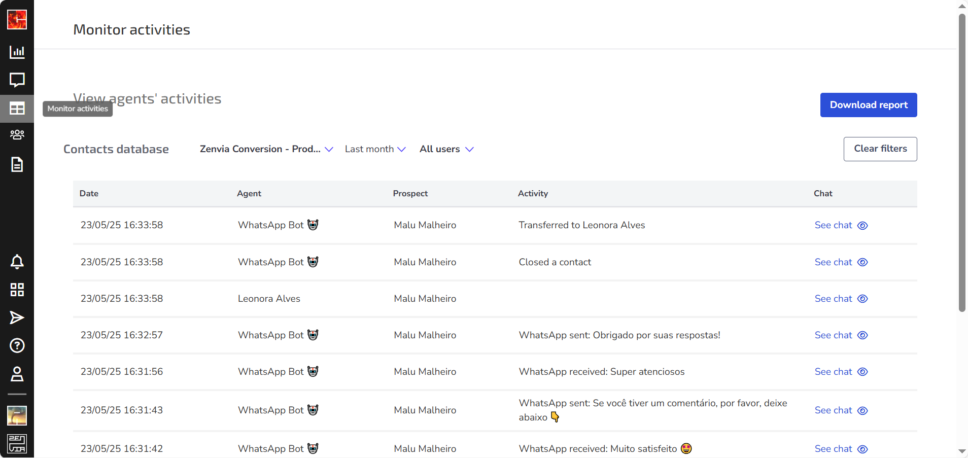 The Monitor Activities feature allows you to track, in detail, all interactions and actions performed by your agents in Zenvia Conversion.