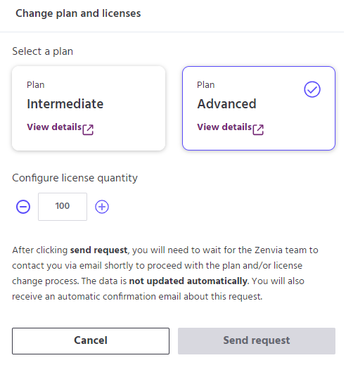 Finally, click Send request. That's it! Your Your request to change plans and/or licenses has been made.