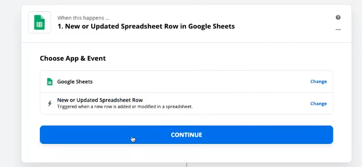 Select the action that will trigger the workflow in Zapier. In this case, the trigger will be adding a new row to the spreadsheet.