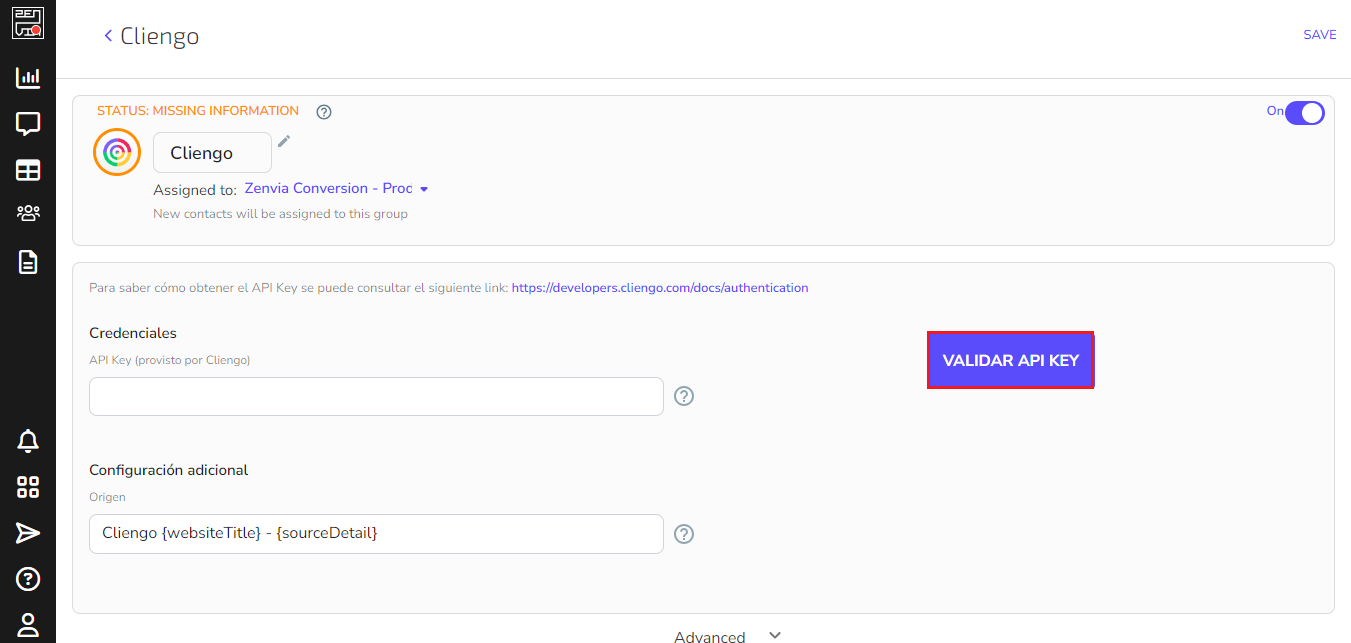 Once you have it, go to Integrations and click on Cliengo and enter the API Key in the appropriate section. Click CHECK API KEY.