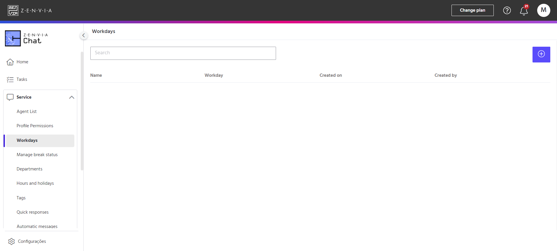 To access it, go to Zenvia Chat - Administrator profile > Service > Workdays.