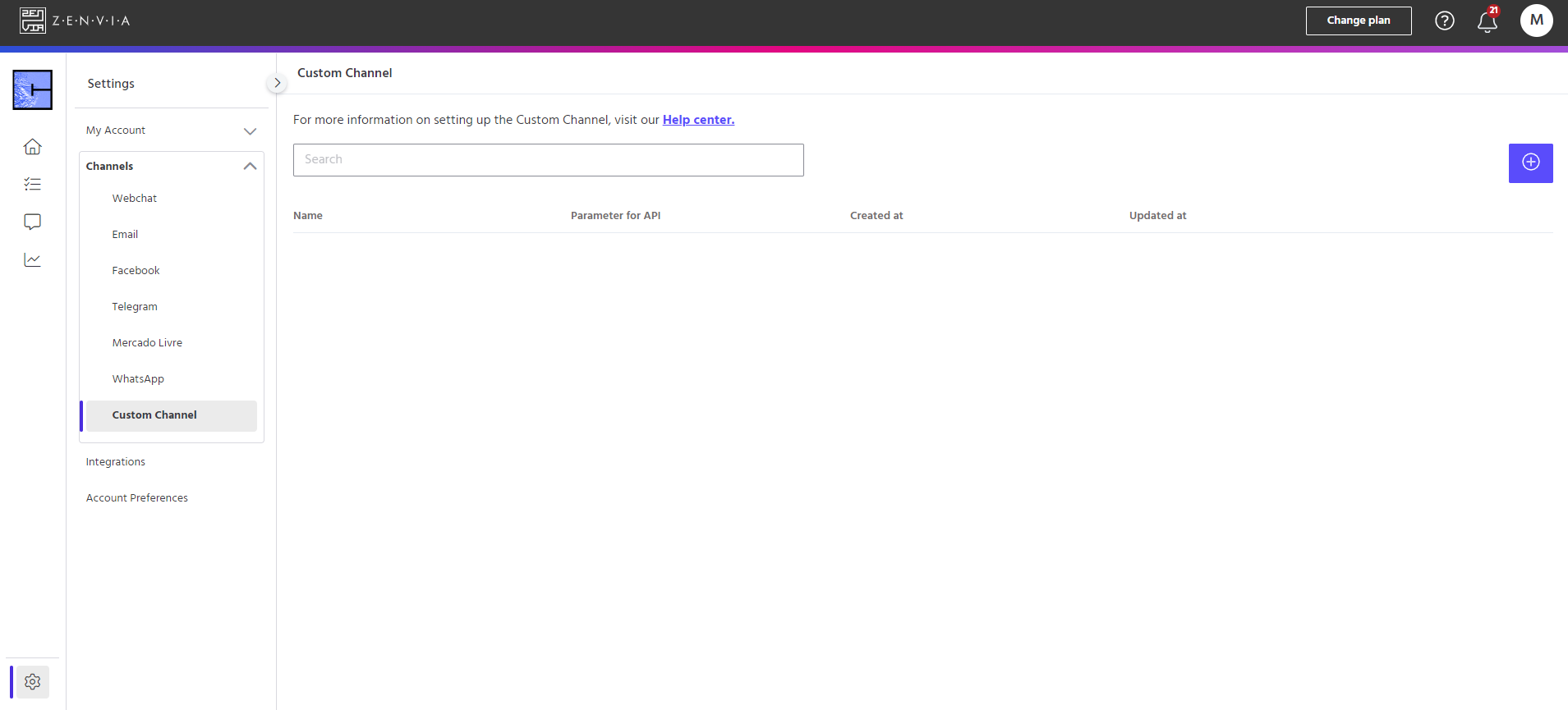 To access this feature, go to Zenvia Chat - Administrator profile > Settings > Channels > Custom Channel.