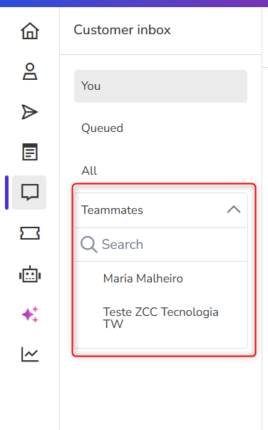 When the shared inbox is disabled, each user only views their own services and tasks, without access to colleagues' conversations in the Teammates section.