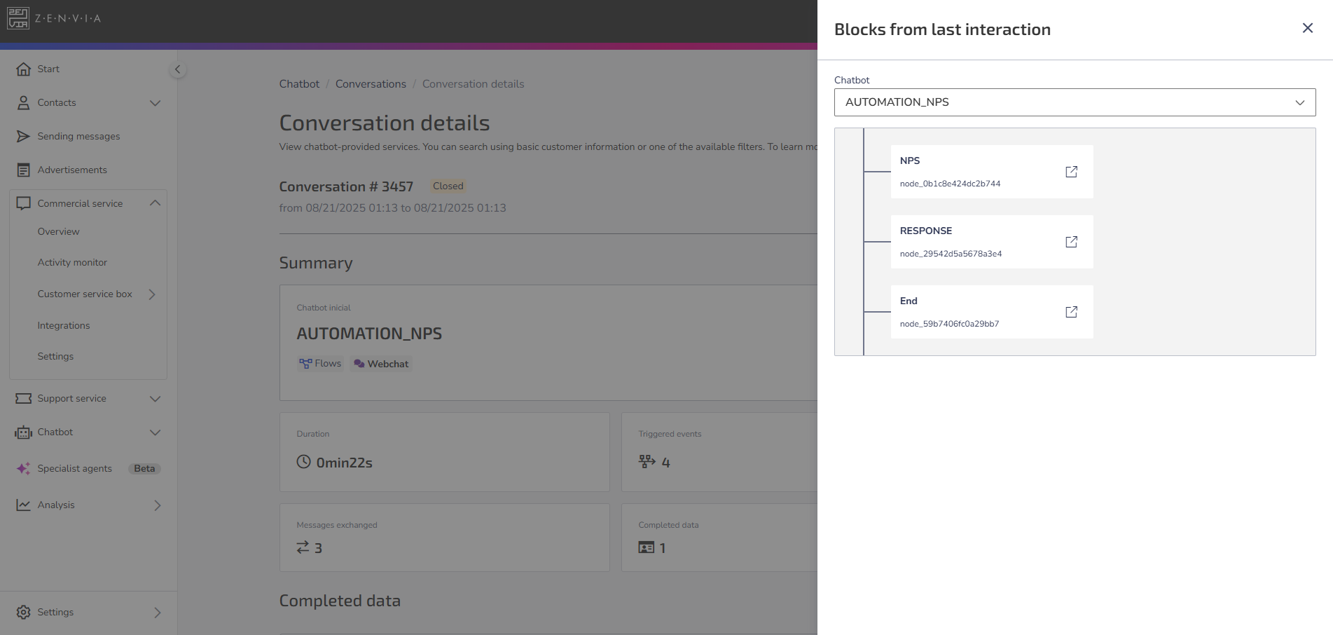 Under Summary you will find conversation information such as Duration, Events triggered, Messages exchanged, and Data filled in.