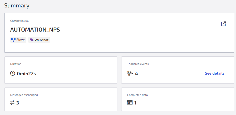 Under Summary you will find conversation information such as Duration, Events triggered, Messages exchanged, and Data filled in.