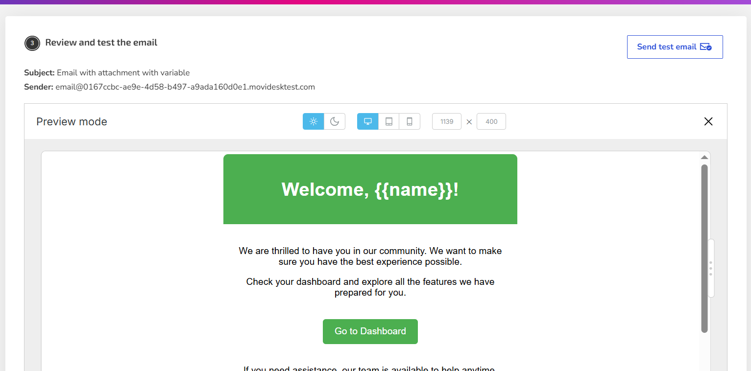 • Subject, message body, and attachments can contain variables in the format {{variable}}.