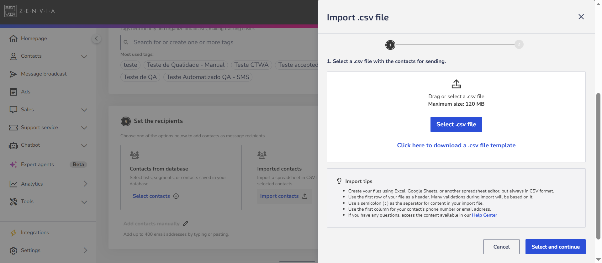 2. Drag and drop the file or click on Select .csv file;