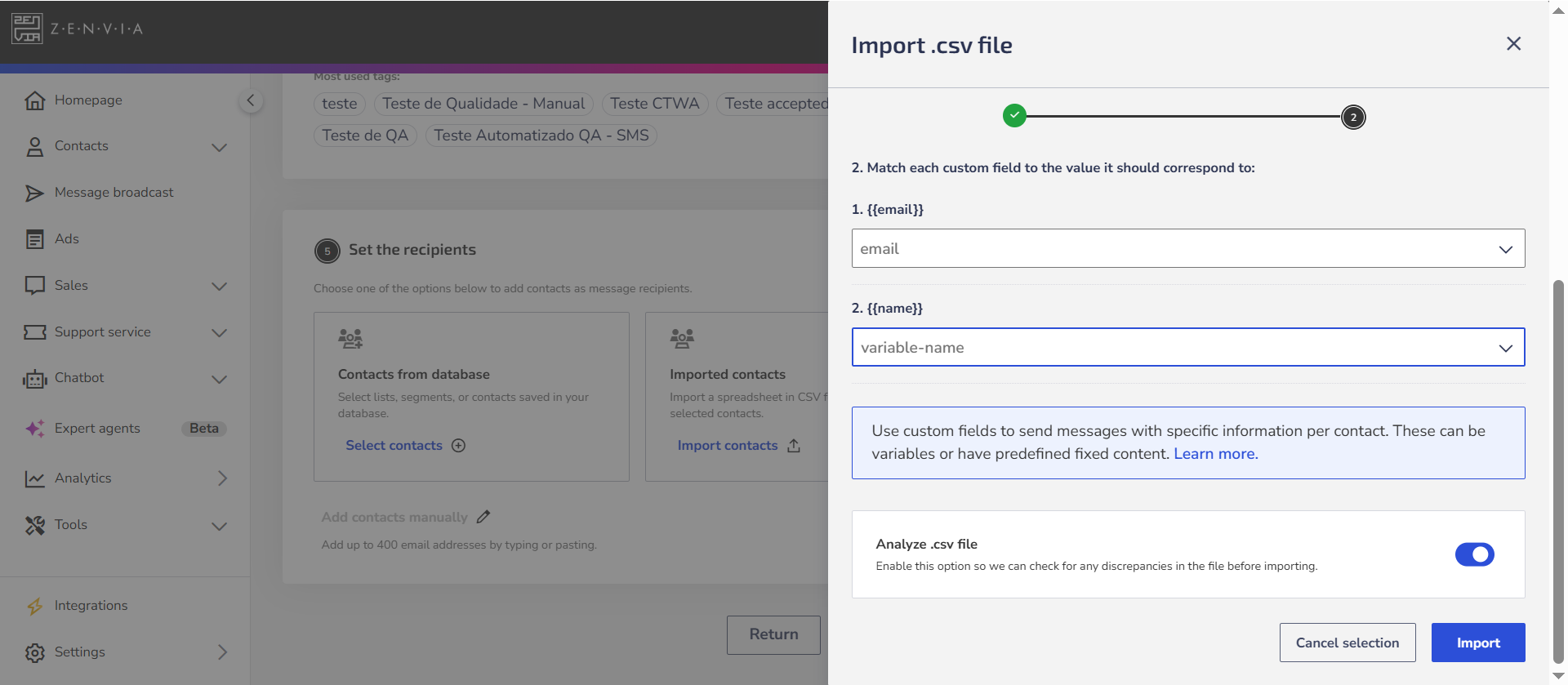 3. In the recipient definition step, upload a CSV spreadsheet with the correspondence between the email and the attachment link for each contact.