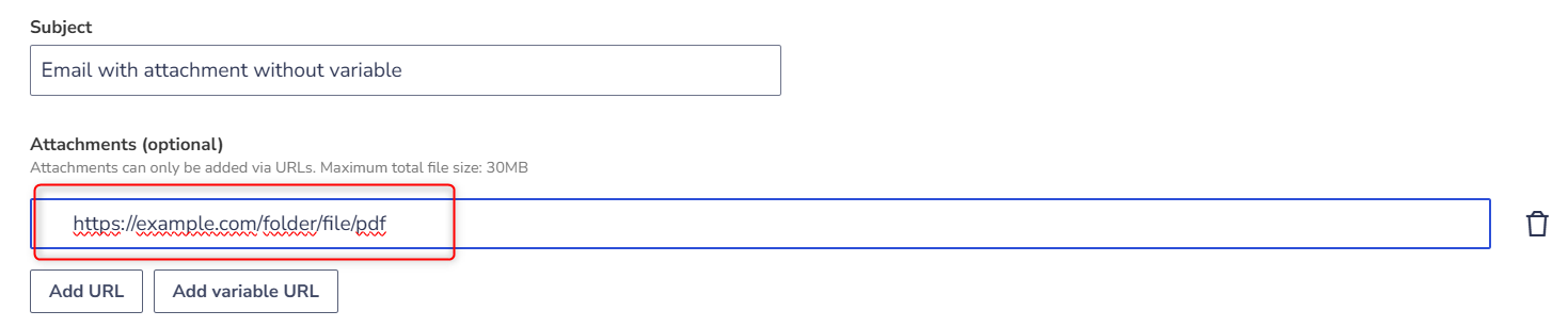 • Subject, message body, and attachments can contain variables in the format {{variable}}.