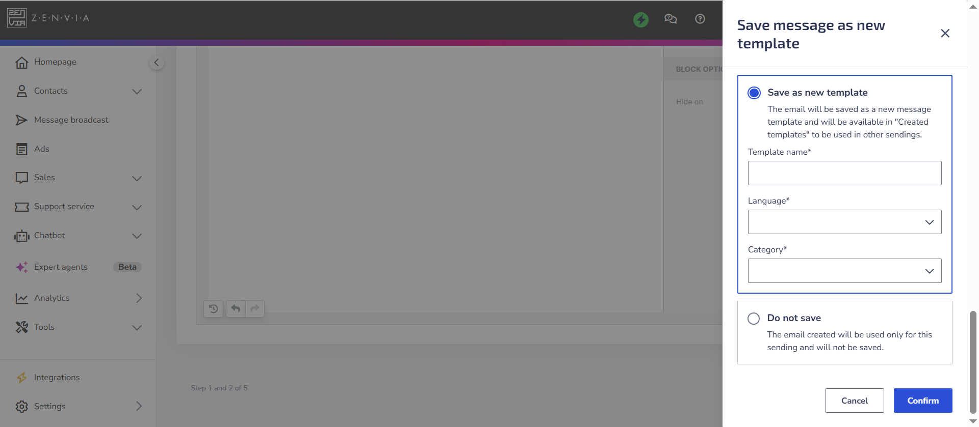 | 💡 Tip: After finalizing the message body and clicking on Continue, you can save the content as a template. If you are using an existing template, you can update it with the changes, save it as a new template (without changing the original), or continue without saving, keeping the changes only for this mailing. If you are creating a template from scratch, you can save it as a new template or continue without saving, according to your needs. |