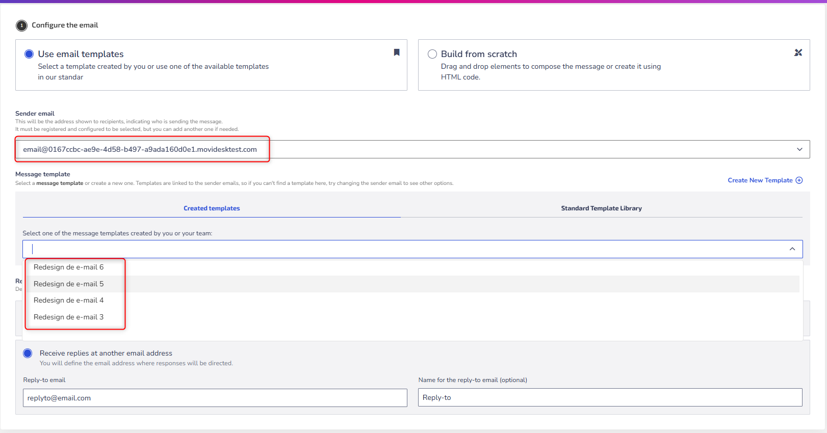 - Created templates: These are customized templates saved in Settings > Message templates > Email. They will only appear if the chosen sender email has templates linked.