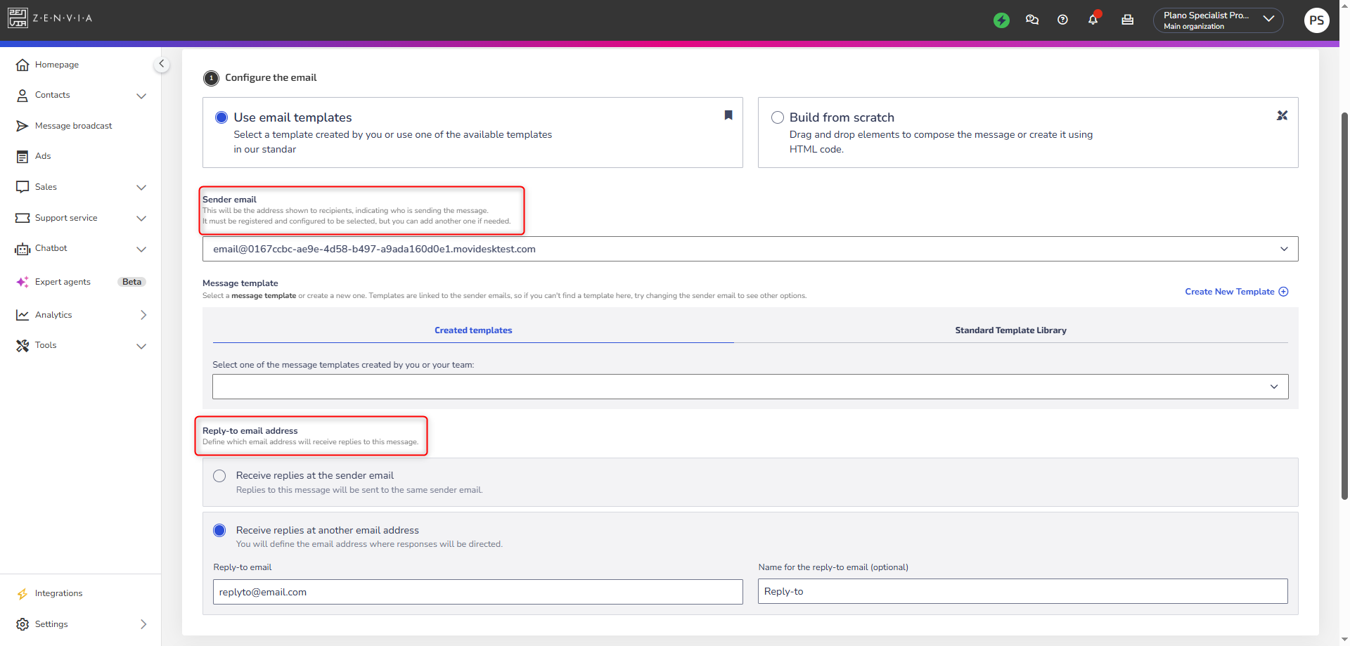 - Select the email address that will be displayed to the recipient. It must be previously registered in Settings > Channels. If the desired address is not available, add a new sender.