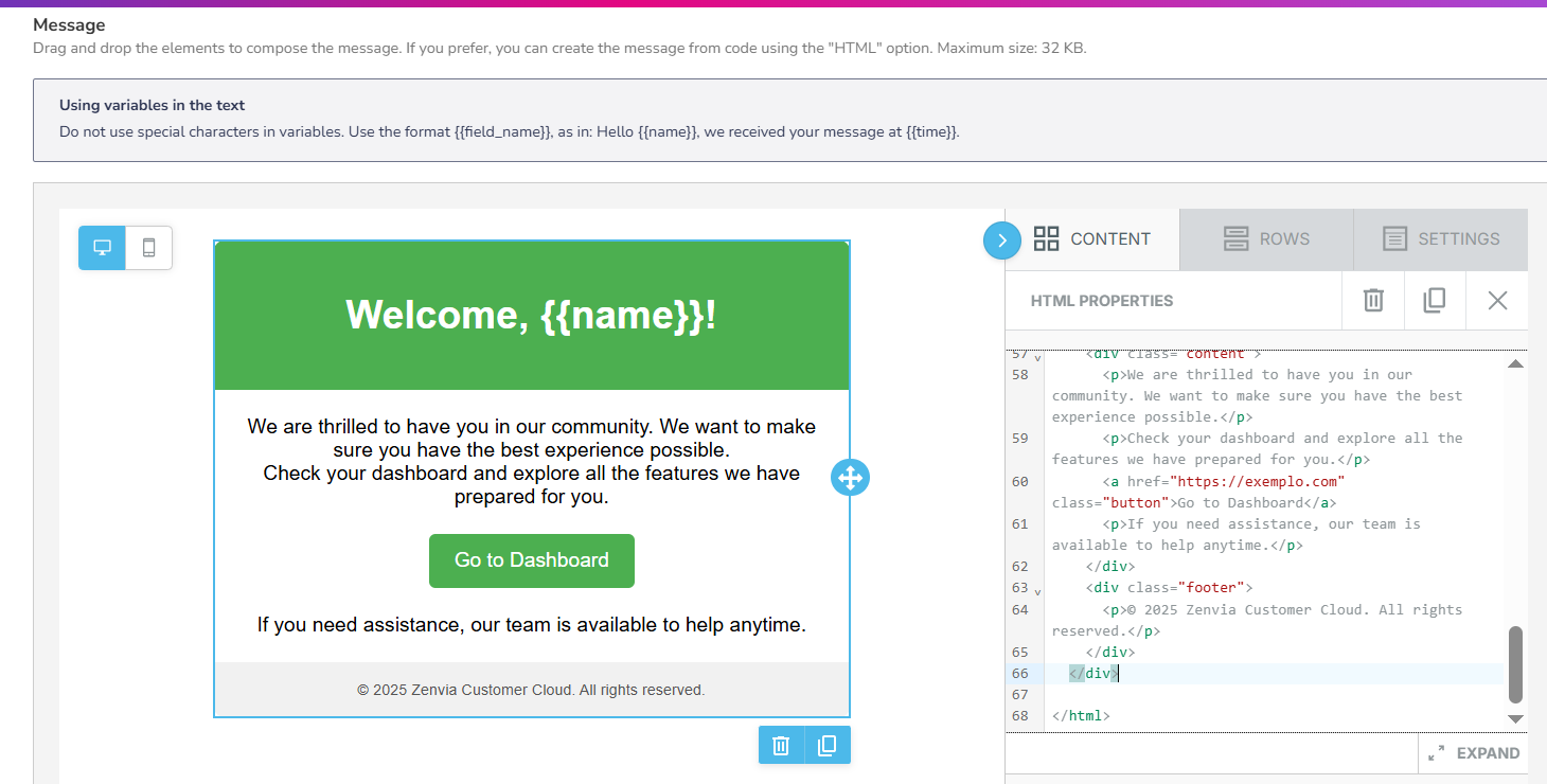 You can include text, images, buttons, separators, and other visual elements. If you prefer to use your own layout or code, add the HTML block in the builder and paste the code directly inside it.