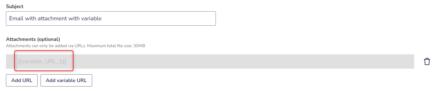 - Subject, message body, and attachments can contain variables in the format {{variable}}.