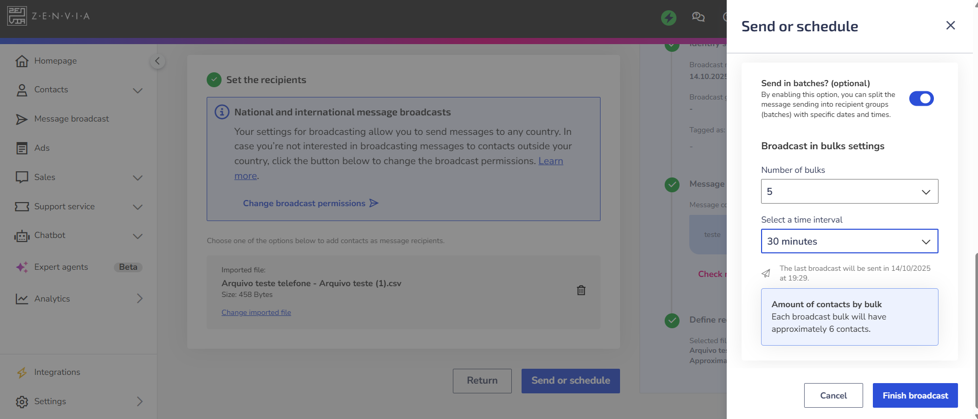 ⚠️ Attention: Batch sending is only available when the message is sent via file import. It is not possible to use this option if you choose to send to your contact base or add contacts manually.