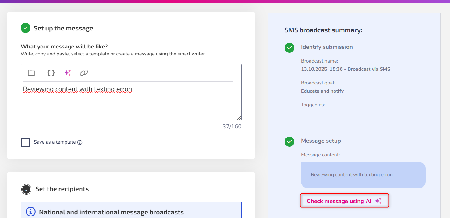 - In the summary of your broadcast, select the Check message with IA option;
