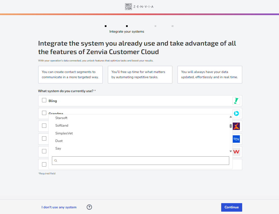After Zoe's introduction, you'll be directed to the Integrate your systems screen. There, you'll see the question: "Which system do you want to integrate?" followed by a list of the most popular systems that can be integrated.