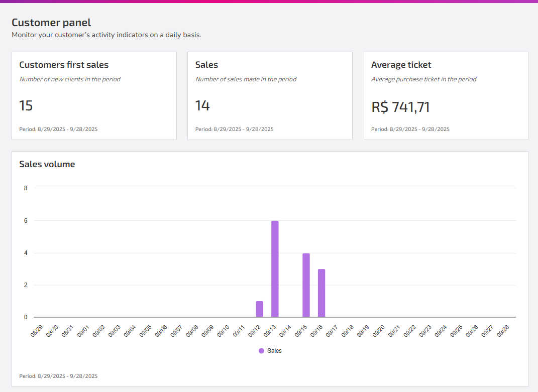 Shows business indicators that help you understand purchasing behavior and sales performance. In summary, it provides a consolidated view of how many new customers you acquired, total sales, average purchase value, and how these sales evolved over time:
