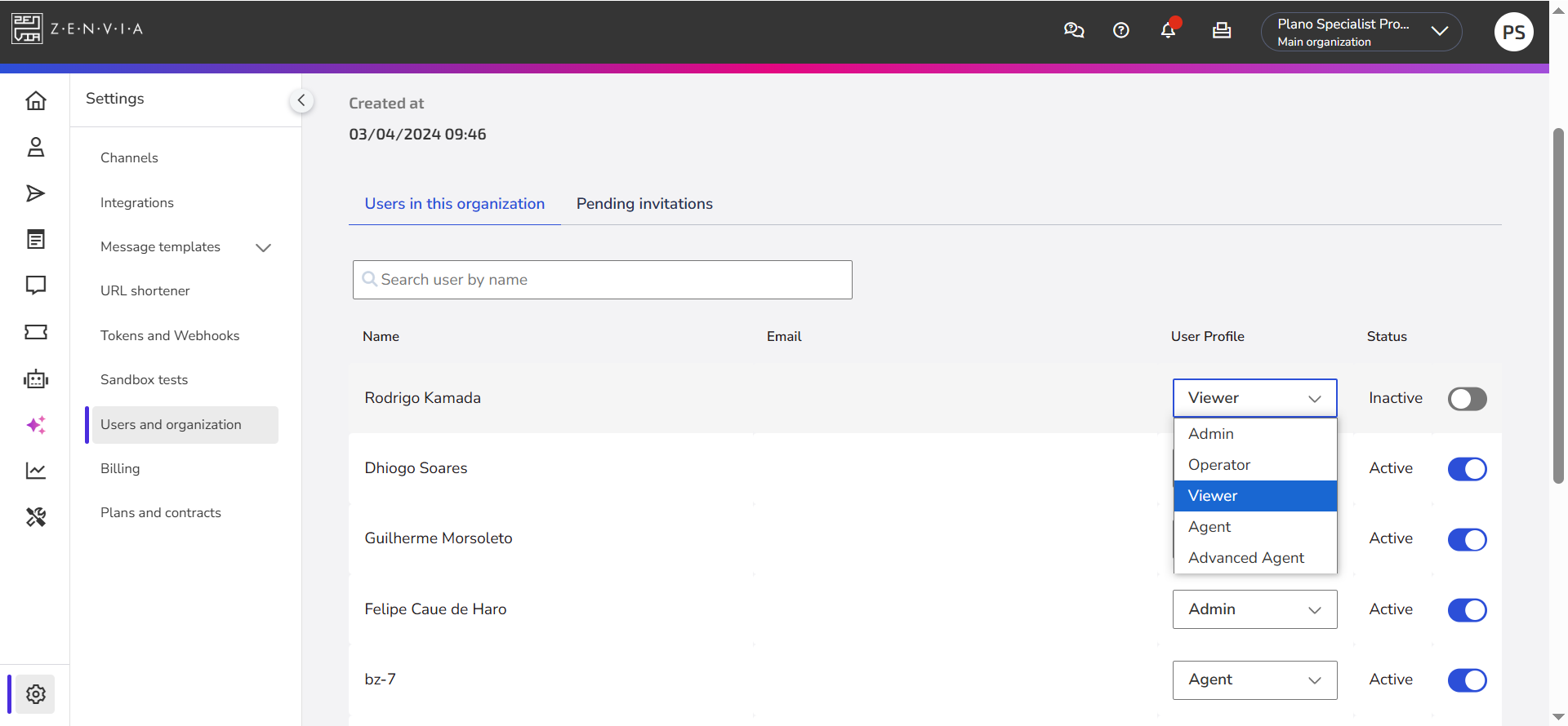 The access profile should be defined when you add a new user to Zenvia Customer Cloud — but if necessary, it can be changed at any time.