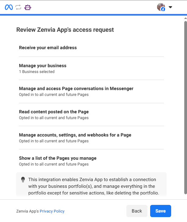 - Opt in to all current and future businesses: Zenvia will have access to all current and future business accounts you manage.