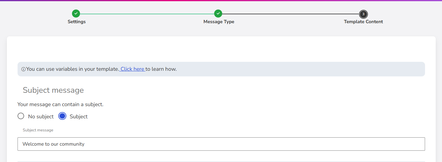 Define the subject line that will appear in the recipient’s inbox. This field allows uppercase and lowercase letters, accents, and spaces.
