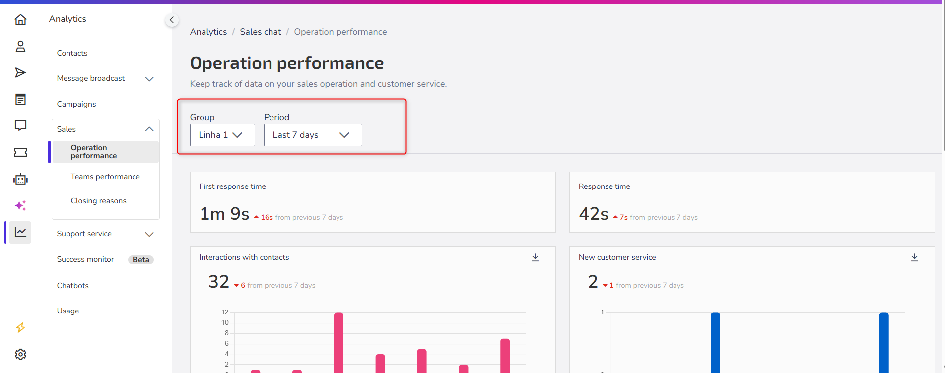 Use the Operation Performance report to monitor the main metrics for conversations and new contacts served by your team.