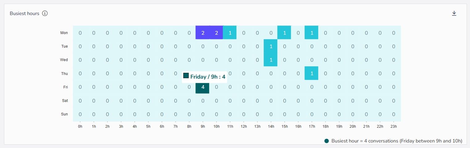 This chart is a heatmap that shows the days and times with the most active conversations. With these metrics, you can better distribute your team's working hours.