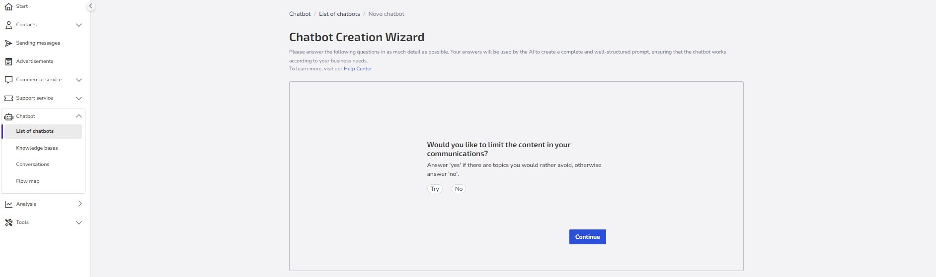 Give the chatbot a name: Choose a clear and objective name that easily identifies the purpose of your chatbot (e.g., "Online Store Support," "Sales Assistant").