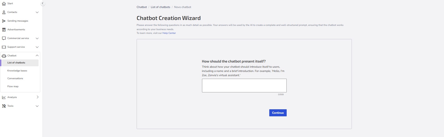 Give the chatbot a name: Choose a clear and objective name that easily identifies the purpose of your chatbot (e.g., "Online Store Support," "Sales Assistant").