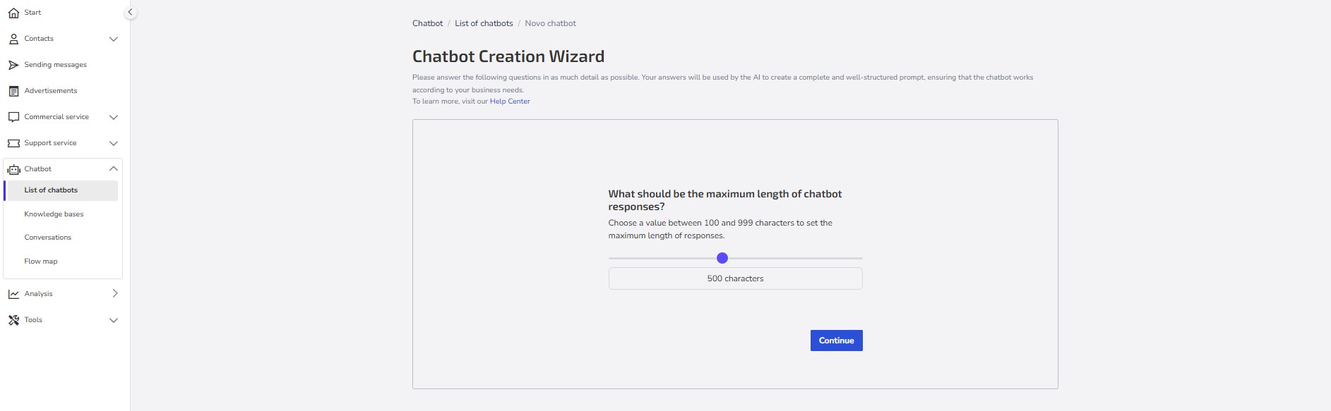 4- Use the slider to choose the maximum size of the responses the chatbot should provide (Between 100 and 999 characters).