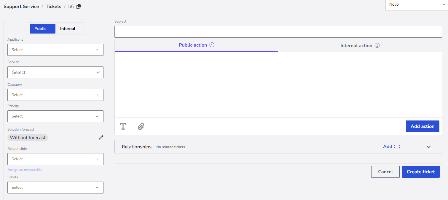 3. Choose whether the ticket will be Public (visible to customers) or Internal (visible only to agents).