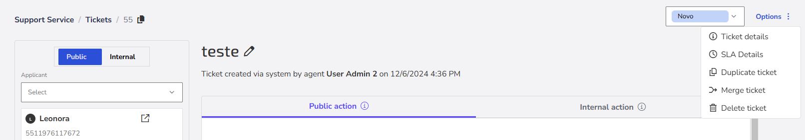 3. Choose whether the ticket will be Public (visible to customers) or Internal (visible only to agents).