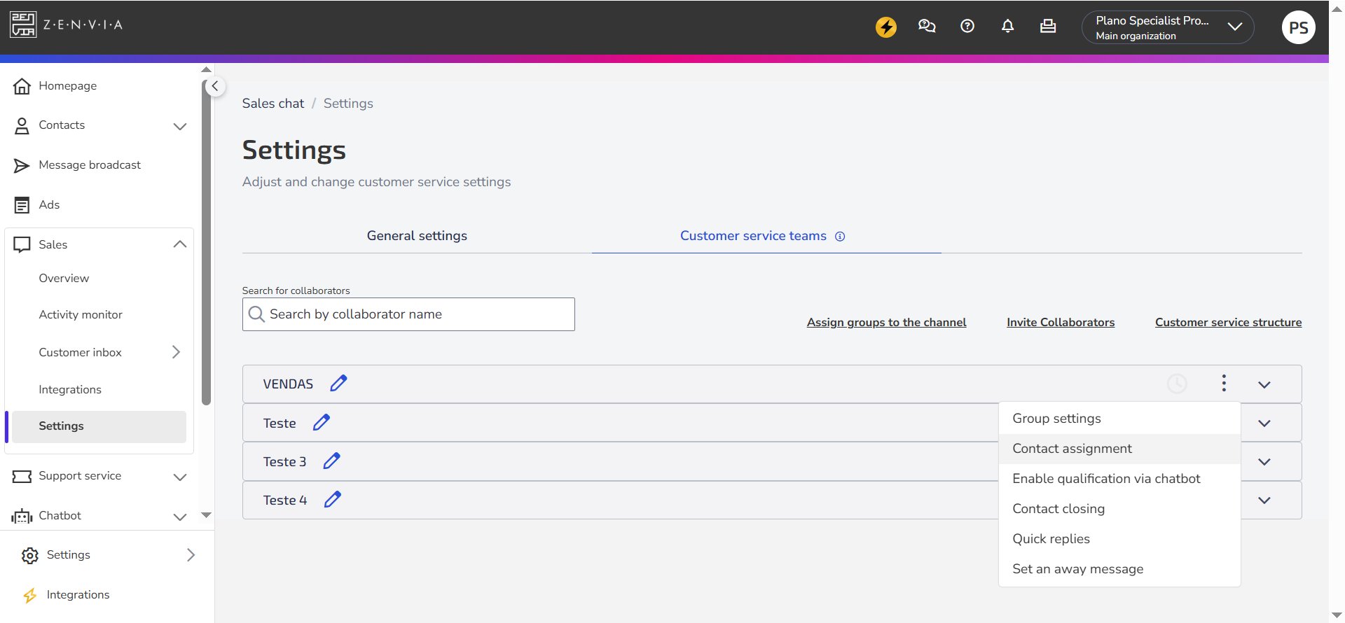 Support groups are configured by the Zenvia team. If you need to create new groups, contact support.