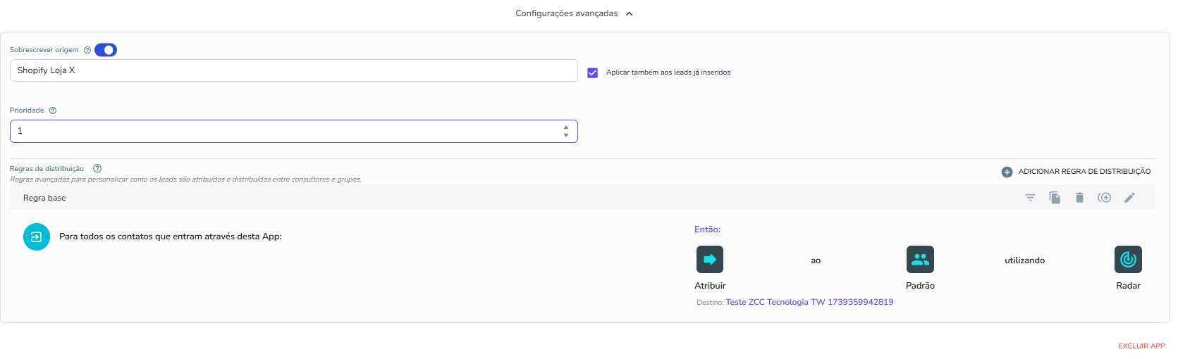 • Distribution rules: Allows creating rules to distribute leads among groups or consultants, based on specific conditions. Example: "Assign to group X using rule Y".
