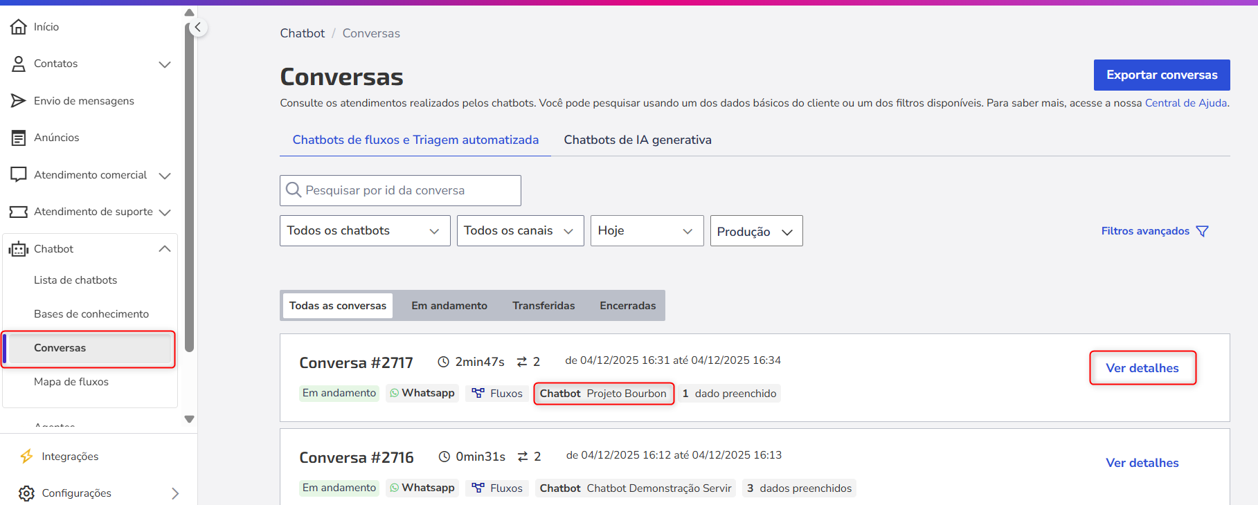 To view the automated service and everything that occurred in the interaction, access **Chatbot > Conversations**. In the list, locate the ongoing conversation and click on **View details**, where it is possible to monitor in real-time all exchanged messages, information captured by the bot, the progress of the flow, and the duration of the interaction. Learn more in Consulting Chatbot Conversations.