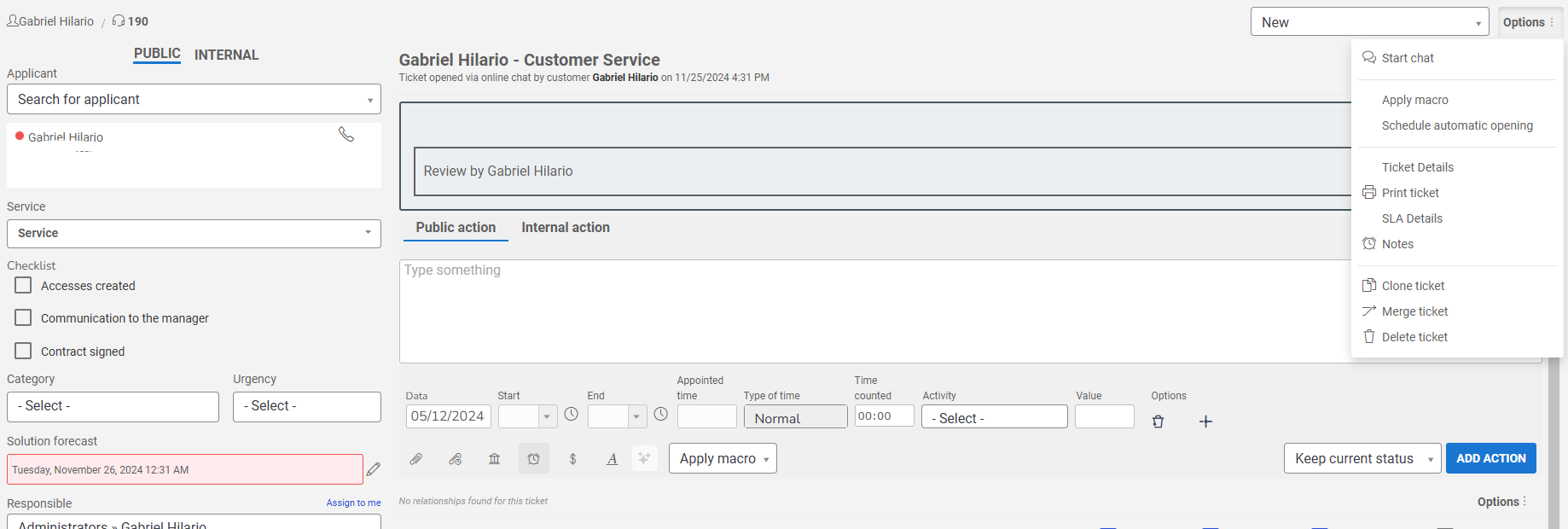 Other detailed information, such as the Ticket Subject, helps to provide context for the request. In the Public Action or Internal Action fields, you can record actions and activities performed, specifying the Date, Start, End, and Logged Time. Additionally, you should complete the Hour Type, indicate the Time logged, and define an Activity and a related Value for the service provided.