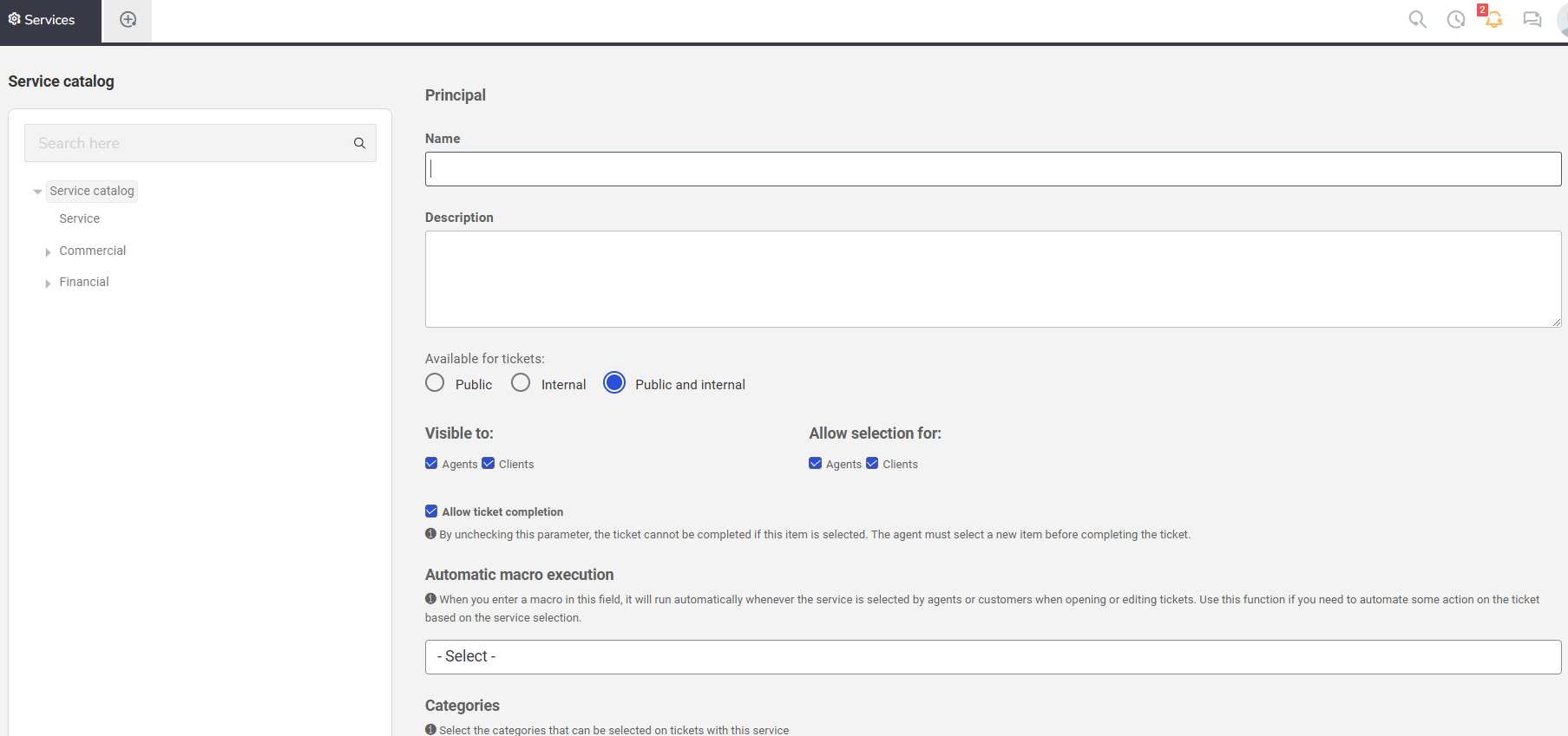 5. Choose who can select the service: Agent, Client, or both;⚠️Attention: Unchecking Allow ticket closureprevents automatic closure, requiring the agent to change the classification to close the ticket.